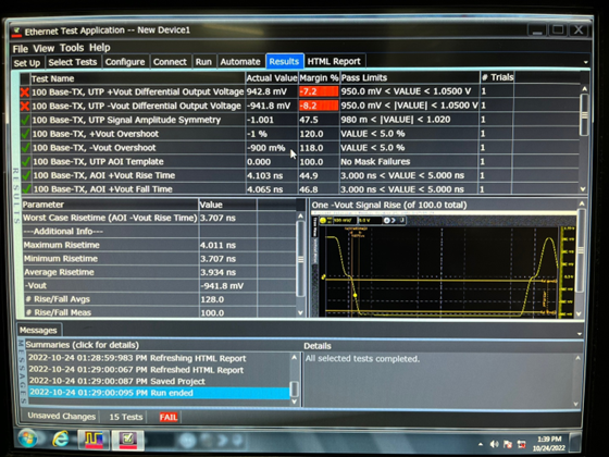 Compliance Test 를 마쳤다. 100M 대역에서 Test 를 진행했다. 전원소스에 따라 Test 결과가 조금씩 달라지는데, 그 중 가장 괜찮게 됐던 Test 이다. 결과는 Fail , Differential Voltage Level 범위안에 전압레벨이 들어오지 않았다. 약 -115mV 정도 차이가 나는데, 이 정도 수치는 상당히 큰 문제이다.